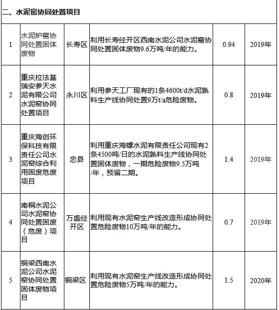 積極穩(wěn)妥推進(jìn)現(xiàn)有水泥企業(yè)協(xié)同處置危險(xiǎn)廢物,作為全市危險(xiǎn)廢物焚燒和填埋集中處置的有效補(bǔ)充,鼓勵和支持在渝西片區(qū)的永川、長壽、銅梁、萬盛經(jīng)開區(qū)以及渝東北片區(qū)的忠縣等區(qū)縣選擇基礎(chǔ)條件好的水泥企業(yè)建設(shè)水泥窯協(xié)同處置危險(xiǎn)廢物項(xiàng)目。到2020年,全市新增水泥窯協(xié)同處置能力43.1萬噸/年。