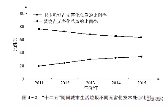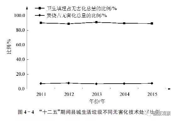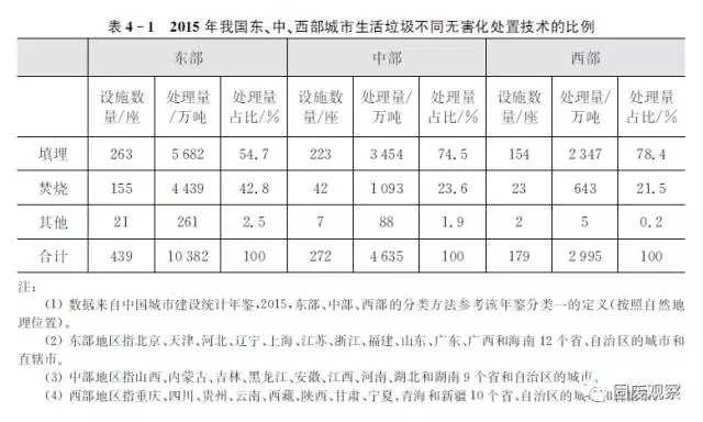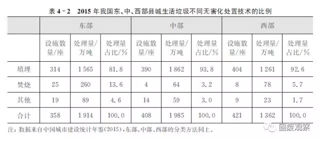 由表4-2可知,2015年我國東部地區(qū)填埋比例是81.8%,中部和西部地區(qū)填埋比例更高,分別是93.8%和92.6%,表明填埋仍然在縣城區(qū)域垃圾處理中占據(jù)著絕對主力位置。