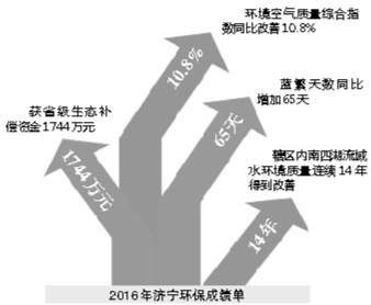 2016年,濟寧市環(huán)境空氣質(zhì)量綜合指數(shù)同比改善10.8%,改善幅度居全省第5位;“藍天白云、繁星閃爍”天數(shù)達245天,同比增加65天,增幅居全省首位,獲省級生態(tài)補償資金1744萬元。