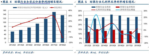 2018Q3,環(huán)保上市公司營(yíng)業(yè)總收入為1369.04億元,同比增加83.37億元,增幅6.48%,增速與去年相比大幅回落。歸屬于母公司的凈利潤(rùn)147.77億元,同比減少17.67億元,下降10.68%。扣除非經(jīng)常性損益后的歸母凈利潤(rùn)共136.04億元,同比減少16.05億元,下降10.55%,與去年同期28.61%的增幅相比大幅下跌。行業(yè)整體毛利率為28.51%,同比增加2.62個(gè)百分點(diǎn),在近幾年毛利率下滑的趨勢(shì)中有所回升,但整體凈利率為10.79%,同比減少16.12個(gè)百分點(diǎn),說(shuō)明毛利率的回升沒(méi)有帶來(lái)凈利率的增加。