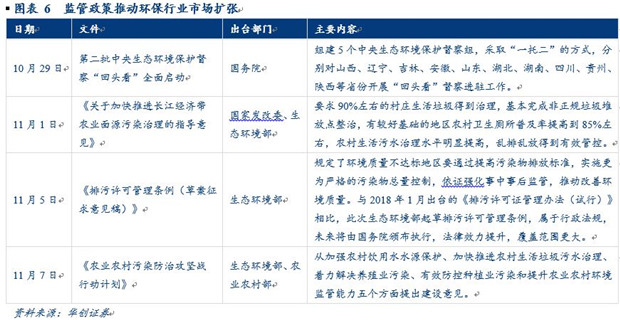 10月29日中央生態(tài)環(huán)境保護(hù)督察“回頭看”全面啟動(dòng),延續(xù)第一批環(huán)保督察“回頭看”的高壓特征,嚴(yán)監(jiān)管有利于環(huán)保需求進(jìn)一步釋放。隨后11月5日《排污許可管理?xiàng)l例(草案征求意見(jiàn)稿)》的出臺(tái)也意味著環(huán)保標(biāo)準(zhǔn)提高、監(jiān)管趨嚴(yán)。而11月7日出臺(tái)的《農(nóng)業(yè)農(nóng)村污染防治攻堅(jiān)戰(zhàn)行動(dòng)計(jì)劃》中提出到2020年要實(shí)現(xiàn)“一保兩治三減四提升”的總目標(biāo),進(jìn)一步釋放環(huán)保行業(yè)的市場(chǎng)空間。