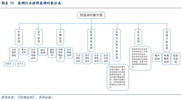 環(huán)境監(jiān)測(cè)行業(yè)按照監(jiān)測(cè)對(duì)象分類,可分為水質(zhì)監(jiān)測(cè)、空氣監(jiān)測(cè)、土壤監(jiān)測(cè)、固體廢物監(jiān)測(cè)、生物監(jiān)測(cè)與生物污染監(jiān)測(cè)、生態(tài)監(jiān)測(cè)和物理污染監(jiān)測(cè)。而每個(gè)子板塊可以進(jìn)一步劃分為環(huán)境質(zhì)量監(jiān)測(cè)和污染源監(jiān)測(cè),以空氣監(jiān)測(cè)為例,可以劃分為空氣環(huán)境質(zhì)量監(jiān)測(cè)和廢氣監(jiān)測(cè),前者主要監(jiān)測(cè)環(huán)境中污染物的分布和濃度,以確定環(huán)境質(zhì)量狀況;后者的主要目的是控制有害物質(zhì)的排放量。對(duì)于不同的監(jiān)測(cè)領(lǐng)域和監(jiān)測(cè)目的也有相對(duì)應(yīng)的不同監(jiān)測(cè)設(shè)備,大氣監(jiān)測(cè)設(shè)備可以分為CO、SO2、NOX、O3、PM10、PM2.5、顆粒物監(jiān)測(cè)設(shè)備等,大型監(jiān)測(cè)點(diǎn)如國(guó)控點(diǎn)、省控點(diǎn)包含以上多個(gè)模塊,而網(wǎng)格化布點(diǎn)的小型化監(jiān)測(cè)設(shè)備主要用于監(jiān)測(cè)以PM2.5為主的單項(xiàng)指標(biāo)。