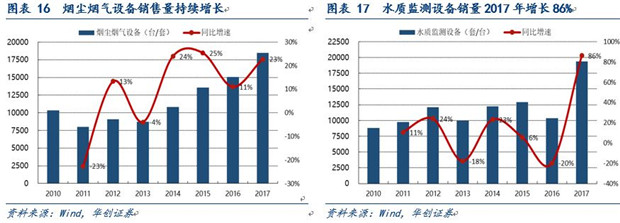 從監(jiān)測(cè)設(shè)備的細(xì)分領(lǐng)域來(lái)看,空氣質(zhì)量監(jiān)測(cè)設(shè)備歷史上經(jīng)歷了兩個(gè)高增長(zhǎng)期,第一次爆發(fā)性增長(zhǎng)為2011-2012年,復(fù)合增速高達(dá)197.3%,第二次出現(xiàn)在2015年,增速為161.7%,這次增長(zhǎng)的主要原因是2016年1月1日后要實(shí)施修訂后的《中華人民共和國(guó)大氣污染防治法》,其中規(guī)定各省大氣污染防治重點(diǎn)任務(wù)完成情況將納入考核,刺激政府需求;此外煙塵煙氣設(shè)備行業(yè)則是從2011年開(kāi)始維持穩(wěn)定的增長(zhǎng)持續(xù)到2017年,期間復(fù)合增長(zhǎng)率14.9%;水質(zhì)監(jiān)測(cè)設(shè)備行業(yè)發(fā)展較晚,在2017年設(shè)備銷量猛增86%,達(dá)到19345套。