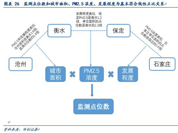 從布點(diǎn)的個(gè)數(shù)來(lái)看,污染嚴(yán)重、面積大、經(jīng)濟(jì)發(fā)達(dá)的地級(jí)市布點(diǎn)更為密集。以河北為例,滄州市和衡水市的污染程度差不多,同作為非省會(huì)的地級(jí)市發(fā)展程度也類似,而滄州市的面積是衡水的1.6倍,而滄州的監(jiān)測(cè)點(diǎn)位數(shù)為衡水的近1.4倍,所以可以認(rèn)為布點(diǎn)個(gè)數(shù)和面積基本為線性正比;而比較保定市和衡水市,保定市是衡水市面積的2.5倍,發(fā)展程度相似,但折算后的單位面積的點(diǎn)位數(shù)保定仍是衡水的1.3倍,這是因?yàn)楸6ǖ腜M2.5濃度是衡水的1.2倍,所以可以認(rèn)為監(jiān)測(cè)點(diǎn)位數(shù)和PM2.5濃度基本符合線性正比關(guān)系;而對(duì)于保定和石家莊,兩者的污染程度類似,保定市的面積是石家莊的1.6倍,但布局的監(jiān)測(cè)點(diǎn)位數(shù)差不多,可以發(fā)現(xiàn)經(jīng)濟(jì)發(fā)達(dá)地區(qū)/省會(huì)城市的網(wǎng)格化監(jiān)測(cè)點(diǎn)位數(shù)會(huì)存在一個(gè)放大倍數(shù)。
