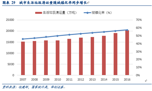 我國(guó)生活垃圾收運(yùn)處理量同城鎮(zhèn)化率具備明顯的正向關(guān)系。隨著城鎮(zhèn)化率水平的提升,我國(guó)城市生活垃圾量穩(wěn)步增加。根據(jù)歷年住建部發(fā)布的《城鄉(xiāng)建設(shè)統(tǒng)計(jì)年鑒》:自2007年至2016年間,城鎮(zhèn)化率提高11個(gè)百分點(diǎn)至57.35%;2016年全國(guó)城鎮(zhèn)生活垃圾清運(yùn)量高達(dá)20362萬(wàn)噸,相比2007年城鎮(zhèn)生活垃圾清運(yùn)量的15215萬(wàn)噸增加了33.82%,年均復(fù)合增長(zhǎng)率約為3.29%。