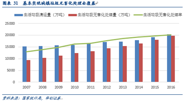 就當(dāng)前而言,我國(guó)城鎮(zhèn)垃圾無(wú)害化處理率超過(guò)95%,絕對(duì)量持續(xù)增長(zhǎng)。2016年,我國(guó)2.03億噸城市垃圾清運(yùn)量中,無(wú)害化處理1.97億噸,占比96%,無(wú)害處處理率同比提升1個(gè)點(diǎn)。預(yù)期未來(lái)城市垃圾無(wú)害化處理率將繼續(xù)維持在高水平。