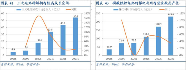 而從產(chǎn)值來(lái)看,三元電池回收企業(yè)主要以拆解提純正極材料再出售為主要業(yè)務(wù),而磷酸鐵鋰電池則主要應(yīng)用于梯次利用。根據(jù)未來(lái)動(dòng)力電池回收量,我們預(yù)計(jì)動(dòng)力電池兩種回收形態(tài)有望在2020-2021年擁有超百億的市場(chǎng)空間,且未來(lái)仍有望保持較高增長(zhǎng)。
