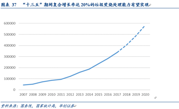 根據(jù)《“十三五”全國(guó)城鎮(zhèn)生活垃圾無(wú)害化處理設(shè)施建設(shè)規(guī)劃》,到2020年底全國(guó)城鎮(zhèn)生活垃圾焚燒處理設(shè)施能力占無(wú)害化處理總能力50%以上,其中東部地區(qū)占60%以上。2016年底,我國(guó)城市垃圾焚燒處理能力為25萬(wàn)噸/日,而根據(jù)規(guī)劃2020年垃圾焚燒處理能力須達(dá)到59萬(wàn)噸/日,為達(dá)到這一目標(biāo),“十三五”期間,生活垃圾焚燒處理能力年復(fù)合增長(zhǎng)率最低須達(dá)到20%的增速。