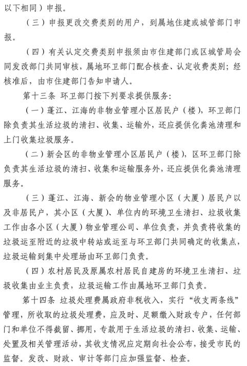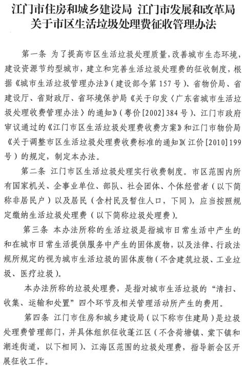 日前, 廣東江門市住建局發(fā)布了關(guān)于征求對(duì)《關(guān)于市區(qū)生活垃圾處理費(fèi)征收管理辦法》修訂意見(jiàn)的公告,詳情如下: