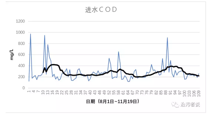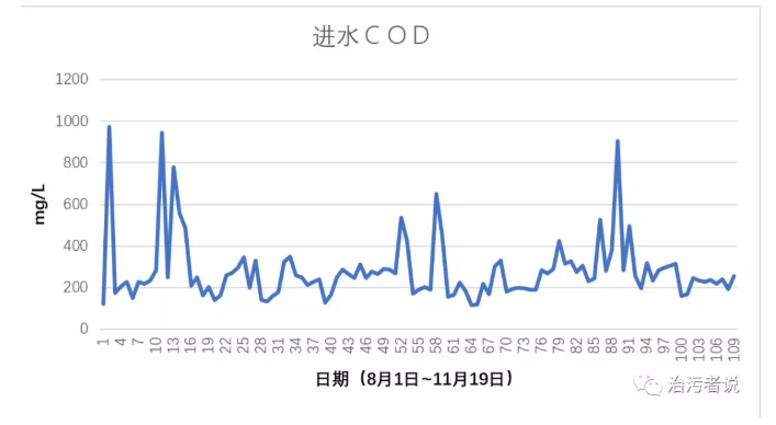 首先對工藝人員懷疑的進水COD進行分析,通過表格軟件對進水的COD進行曲線分析可以看到進水的COD變化情況。
