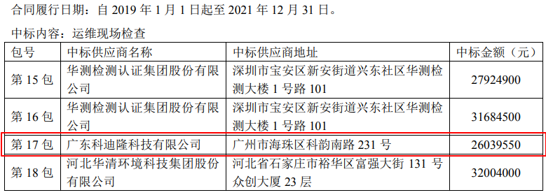 11月15日,中國環(huán)境監(jiān)測總站“國家環(huán)境空氣監(jiān)測網(wǎng)城市環(huán)境空氣自動監(jiān)測站運(yùn)行維護(hù)項目”對外公布中標(biāo)結(jié)果。前19包招標(biāo)成功,總金額為8.39億元。其中,廣東科迪隆科技有限公司(簡稱“科迪隆”)中標(biāo)運(yùn)維現(xiàn)場檢查第17包,中標(biāo)金額為26,039,550元。
