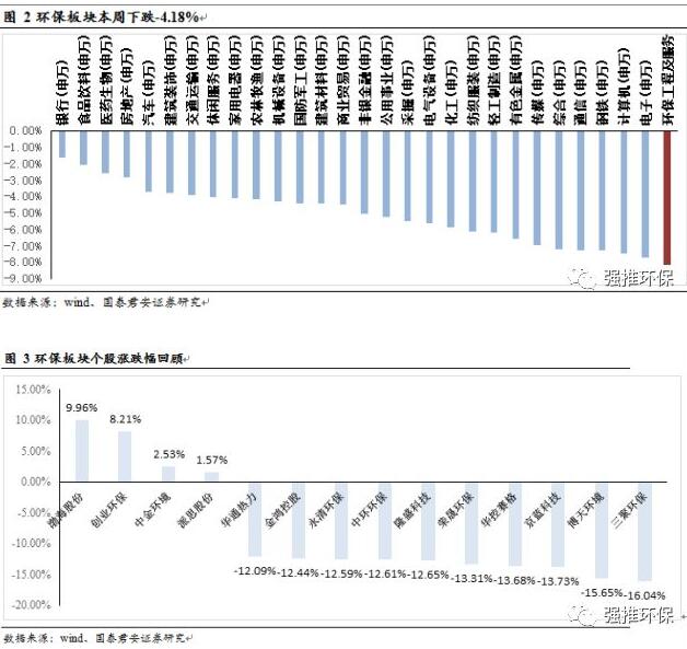 本周市場行情概覽:市場行情概覽:電力、水務(wù)、燃氣和環(huán)保板塊分別下跌4.40%、4.59%、2.87%、8.16%;上證綜指、深證成指和創(chuàng)業(yè)板指分別下跌3.72%、5.28%、6.74%。漲幅前四名:渤海股份(9.96%)、創(chuàng)業(yè)環(huán)保(8.21%)、中金環(huán)境(2.53%)、派思股份(1.57%)。跌幅后五名:三聚環(huán)保(-16.04%)、博天環(huán)境(-15.65%)、京藍科技(-13.73%)、華控賽格(-13.68%)、榮晟環(huán)保(-13.31%)。
