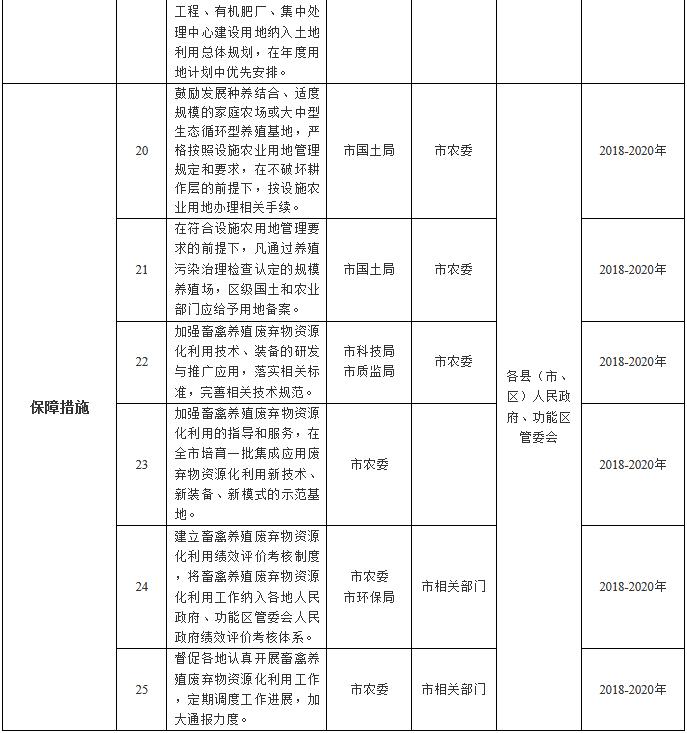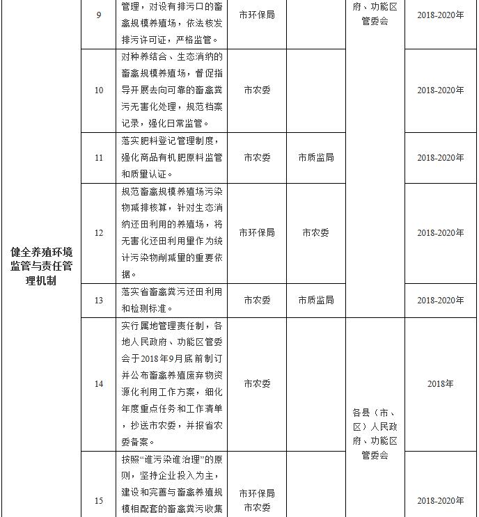(九)堅持屬地責(zé)任管理。畜禽養(yǎng)殖廢棄物資源化利用實(shí)行屬地管理責(zé)任制,各地人民政府、功能區(qū)管委會對本行政區(qū)域內(nèi)的畜禽養(yǎng)殖廢棄物資源化利用工作負(fù)總責(zé),強(qiáng)化組織領(lǐng)導(dǎo),明確部門職責(zé),建立協(xié)調(diào)機(jī)制,加強(qiáng)政策扶持,強(qiáng)化日常監(jiān)管,健全督查制度和巡查機(jī)制,確保各項任務(wù)落實(shí)到位。堅持保供給與保生態(tài)并重,落實(shí)“菜籃子”市長負(fù)責(zé)制,統(tǒng)籌環(huán)境保護(hù)與畜牧業(yè)協(xié)調(diào)發(fā)展。各縣(市、區(qū))人民政府、功能區(qū)管委會應(yīng)于2018年10月底前制訂并公布畜禽養(yǎng)殖廢棄物資源化利用工作方案,細(xì)化年度重點(diǎn)任務(wù)和工作清單,抄送市農(nóng)委,并報省農(nóng)委備案。
