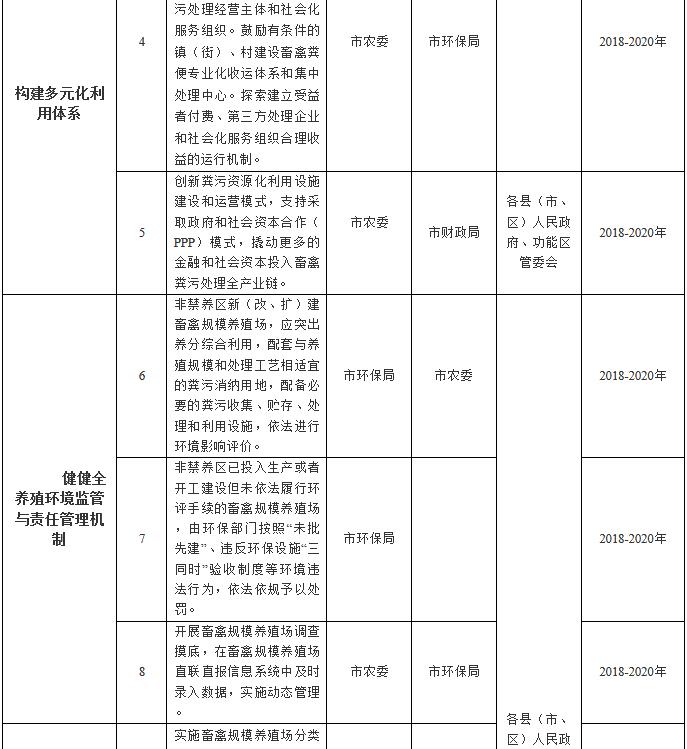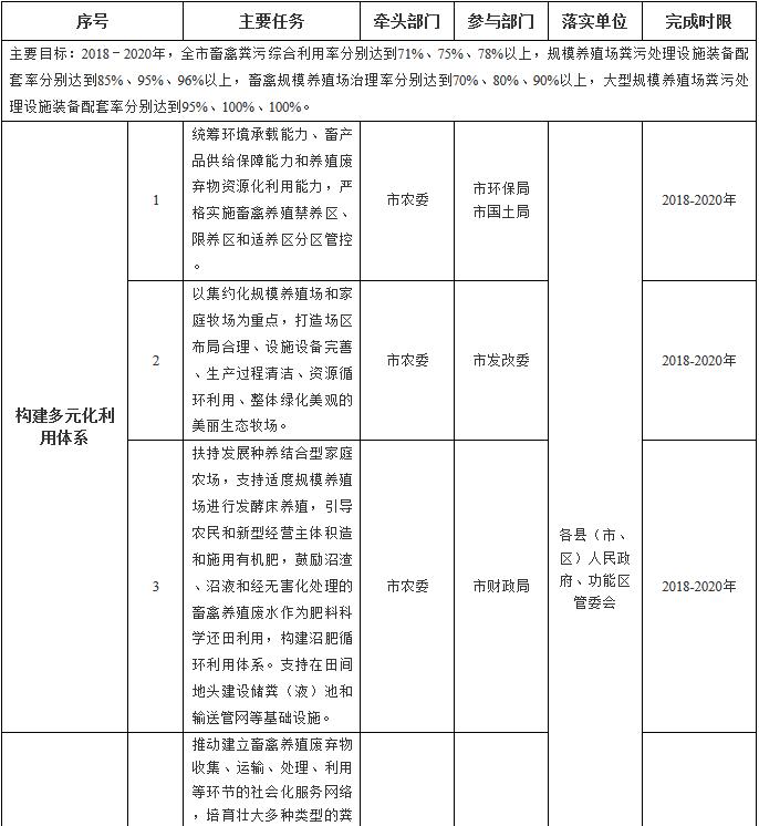 (二)主要目標(biāo)。到2019年,大型規(guī)模養(yǎng)殖場糞污處理設(shè)施裝備配套率達(dá)到100%;到2020年,建立科學(xué)規(guī)范、權(quán)責(zé)清晰、約束有力的畜禽養(yǎng)殖廢棄物資源化利用體系,構(gòu)建種養(yǎng)循環(huán)發(fā)展機(jī)制,全市畜禽糞污綜合利用率達(dá)到78%以上,規(guī)模養(yǎng)殖場糞污處理設(shè)施裝備配套率達(dá)到96%以上,規(guī)模養(yǎng)殖場治理率達(dá)到90%以上。