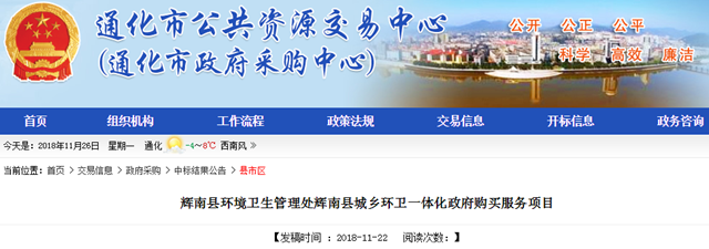 2018年11月22日,吉林省通化市輝南縣城鄉(xiāng)環(huán)衛(wèi)一體化政府購(gòu)買(mǎi)服務(wù)項(xiàng)目發(fā)布中標(biāo)公示,中國(guó)天楹股份有限公司成為中標(biāo)的社會(huì)資本方,中標(biāo)金額為3793.29萬(wàn)/年,服務(wù)期限3年,中標(biāo)總金額達(dá)1.14億。