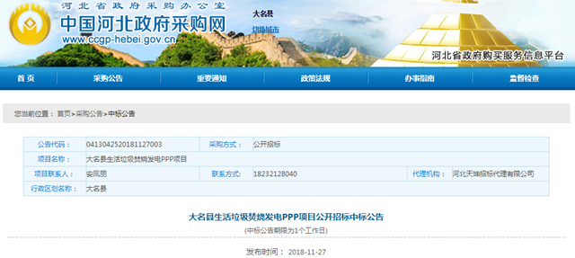 2018年11月27日,河北省大名縣生活垃圾焚燒發(fā)電PPP項(xiàng)目發(fā)布中標(biāo)公告,上海康恒環(huán)境股份有限公司成為中標(biāo)的社會(huì)資本方,垃圾處理服務(wù)費(fèi)單價(jià)為57元/噸。