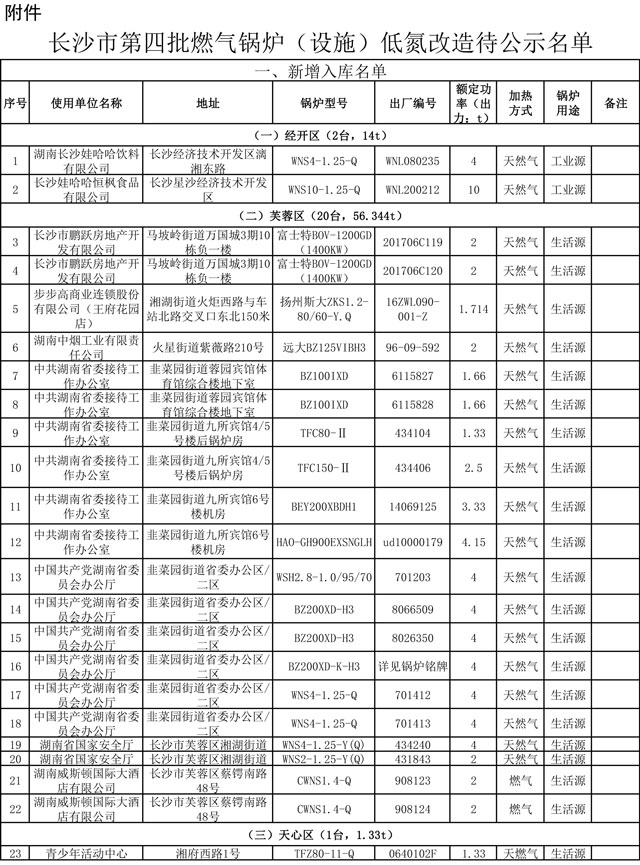 2020年6月,根據(jù)《長沙市燃?xì)忮仩t(設(shè)施)低氮改造工作補(bǔ)充通知》要求,市藍(lán)天辦進(jìn)行了第四批次燃?xì)忮仩t(設(shè)施)低氮改造待公示名單征集,經(jīng)各區(qū)縣上報統(tǒng)計,此批次共減少29臺鍋爐、蒸噸數(shù)下調(diào)94.486蒸噸,調(diào)整鍋爐用途3臺(3蒸噸)(詳見附件),最終確定全市應(yīng)改造鍋爐為1144臺(具體詳見附件)。 附...