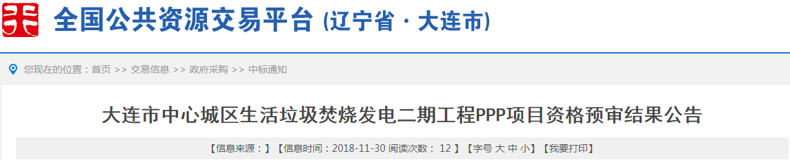 11月30日,遼寧省大連市中心城區(qū)生活垃圾焚燒發(fā)電二期工程PPP項(xiàng)目發(fā)布資格預(yù)審結(jié)果公告。 入圍的企業(yè)包括: 瀚藍(lán)環(huán)境股份有限公司、 重慶三峰環(huán)境集團(tuán)股份有限公司(聯(lián)合體成員:中冶焦耐(大連)工程技術(shù)有限公司)、 浙江偉明環(huán)保股份有限公司、 中國(guó)環(huán)境保護(hù)集團(tuán)有限公司、 中電國(guó)際新能源控股有限公司、 ...