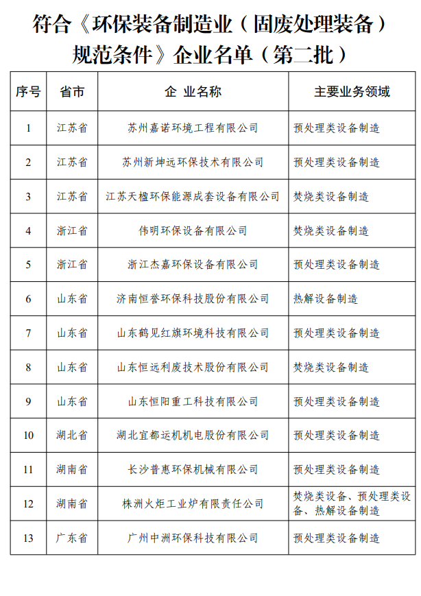 符合《環(huán)保裝備制造業(yè)(固廢處理裝備)規(guī)范條件》企業(yè)名單(第二批)