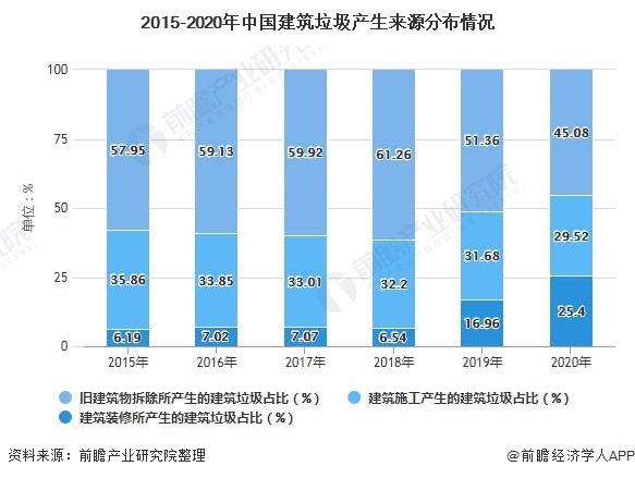 1、6成以上建筑垃圾來自于拆除舊建筑時 根據(jù)建筑垃圾的來源劃分,我國建筑垃圾的來源可劃分為舊建筑物拆除時所產(chǎn)生的建筑垃圾、現(xiàn)有建筑物裝修時所產(chǎn)生的建筑垃圾和新建建筑物在施工時產(chǎn)的建筑垃圾三大類。 根據(jù)建筑垃圾的來源劃分,2020年,我國舊建筑物拆除所產(chǎn)生的建筑垃圾占45.08%左右,建筑施工產(chǎn)生的垃...