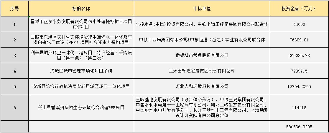 2021年1月以來,環(huán)保領(lǐng)域有不少大標落地,本文梳理了6個中標項目,總投資額超58億元。值得注意的是,水環(huán)境項目標的一如既往是大標的常見落腳點,而本次6個標的有超過59%的投資額由環(huán)衛(wèi)貢獻,尤其是利辛縣城鄉(xiāng)環(huán)衛(wèi)一體化工程項目(特許經(jīng)營)采購項目,26年的投資總額將超過26億元。 晉城市正源水務(wù)發(fā)展有...