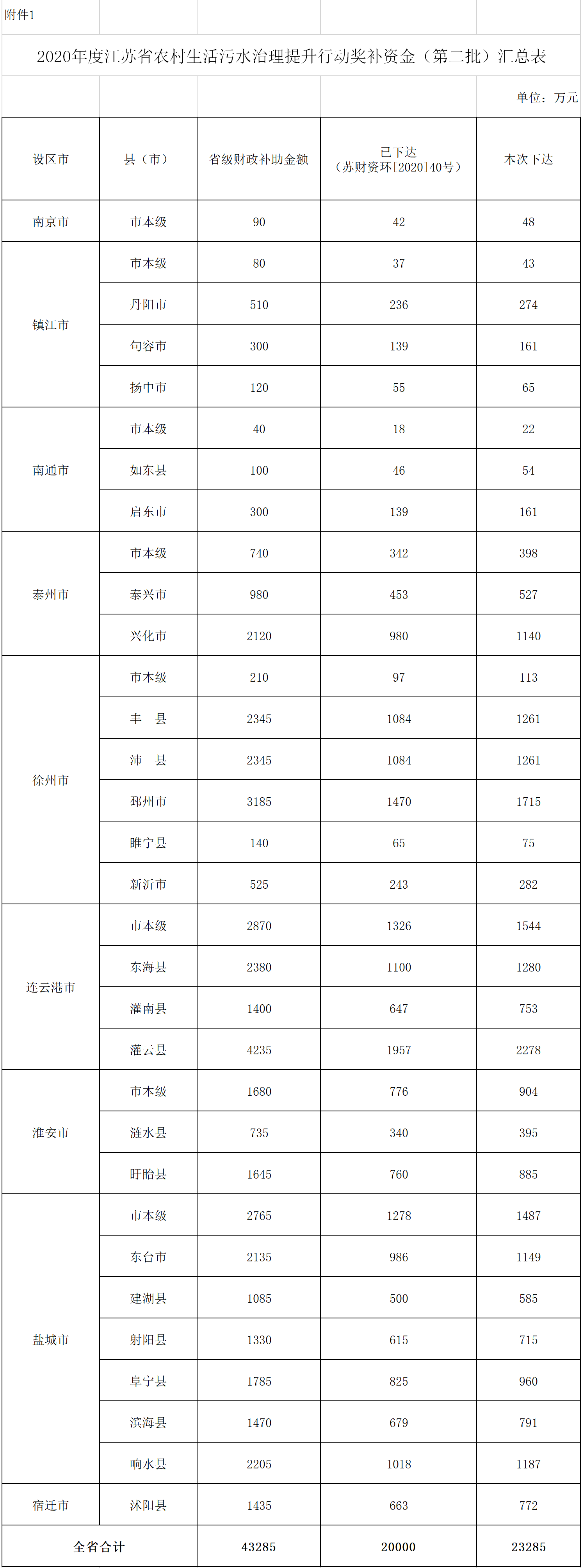 關(guān)于下達(dá)2020年度全省農(nóng)村生活污水治理提升行動(dòng)獎(jiǎng)補(bǔ)資金(第二批)的通知蘇財(cái)資環(huán)〔2020〕57號(hào) 各設(shè)區(qū)市、縣(市)財(cái)政局、生態(tài)環(huán)境局: 根據(jù)省政府辦公廳印發(fā)的《江蘇省農(nóng)村生活污水治理提升行動(dòng)方案》(蘇政辦發(fā)〔2020〕38號(hào))和省生態(tài)環(huán)境廳等四部門(mén)聯(lián)合印發(fā)的《江蘇省2020年農(nóng)村生活污水治理專(zhuān)項(xiàng)...