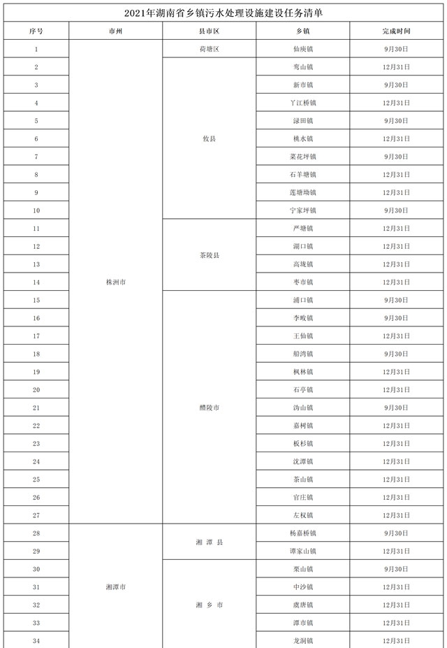 湖南省住房和城鄉(xiāng)建設(shè)廳關(guān)于《2021年湖南省鄉(xiāng)鎮(zhèn)污水處理設(shè)施建設(shè)任務(wù)清單》的公示 按照《湖南省鄉(xiāng)鎮(zhèn)污水處理設(shè)施建設(shè)四年行動實施方案(2019-2022年)》(湘政辦發(fā)﹝2019﹞43號)要求,我廳近期組織各地對2021年鄉(xiāng)鎮(zhèn)污水處理設(shè)施建設(shè)任務(wù)進行了摸排,并對上報的計劃任務(wù)進行了初步審核,街道、建制...