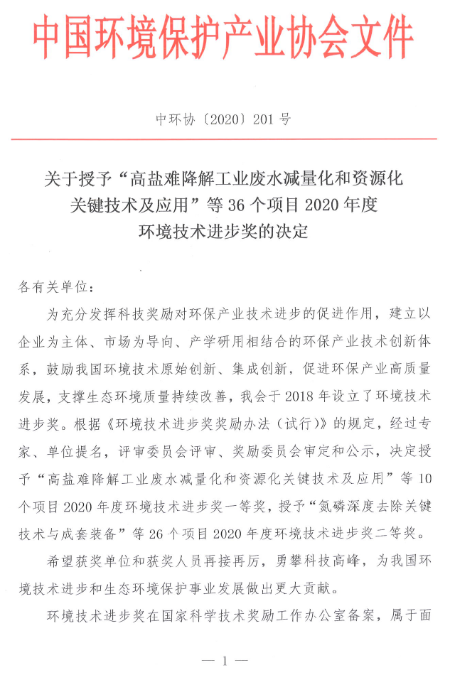 中環(huán)協(xié)〔2020〕201號關于授予“高鹽難降解工業(yè)廢水減量化和資源化關鍵技術及應用”等36個項目2020年度環(huán)境技術進步獎的決定 各有關單位: 為充分發(fā)揮科技獎勵對環(huán)保產業(yè)技術進步的促進作用,建立以企業(yè)為主體、市場為導向、產學研用相結合的環(huán)保產業(yè)技術創(chuàng)新體系,鼓勵我國環(huán)境技術...