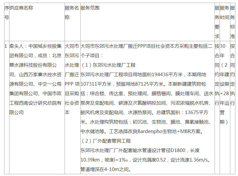 2020年11月26日,大同市西郊污水處理廠擴容新廠PPP項目和大同市東郊污水處理廠搬遷PPP項目成交公告發(fā)布。 一、大同市東郊污水處理廠搬遷PPP項目 中標(成交)信息 供應(yīng)商名稱:牽頭人:中國城鄉(xiāng)控股集團有限公司,成員:北京碧水源科技股份有限公司、山西萬家寨水控水資源有限公司、中交一公局集團有限...
