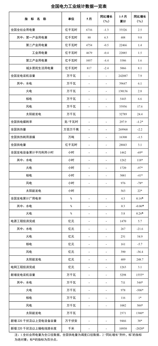 國(guó)家能源局發(fā)布1-5月份全國(guó)電力工業(yè)統(tǒng)計(jì)數(shù)據(jù),光伏裝機(jī)容量約3.3億千瓦