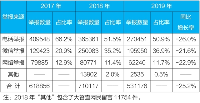 2019年,全國“12369環(huán)保舉報(bào)聯(lián)網(wǎng)管理平臺(tái)”(以下簡稱“聯(lián)網(wǎng)平臺(tái)”)共接到公眾舉報(bào)531176件,同比下降25.2%。所有舉報(bào)中,電話舉報(bào)270451件,微信舉報(bào)195950件,網(wǎng)絡(luò)舉報(bào)62240件,其他渠道2535件,其中電話舉報(bào)下降26.0%...