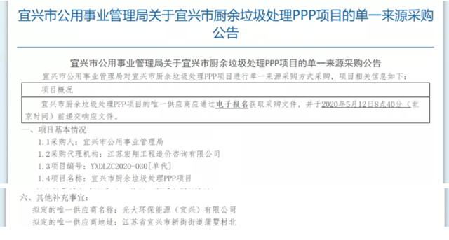 E20研究院數(shù)據(jù)中心從E標(biāo)通(信息來(lái)源:全國(guó)各級(jí)政府采購(gòu)網(wǎng)/公共資源交易平臺(tái))獲悉,5月8日,江蘇省江陰市餐廚廢棄物集中處理PPP項(xiàng)目(一期)預(yù)成交結(jié)果公示,預(yù)成交供應(yīng)商為:光大環(huán)保能源(江陰)有限公司。 兩日前,5月6日,江蘇省宜興市發(fā)布宜興市廚余垃圾處理PPP項(xiàng)目的單一來(lái)源采購(gòu)公告,擬定單一來(lái)源...