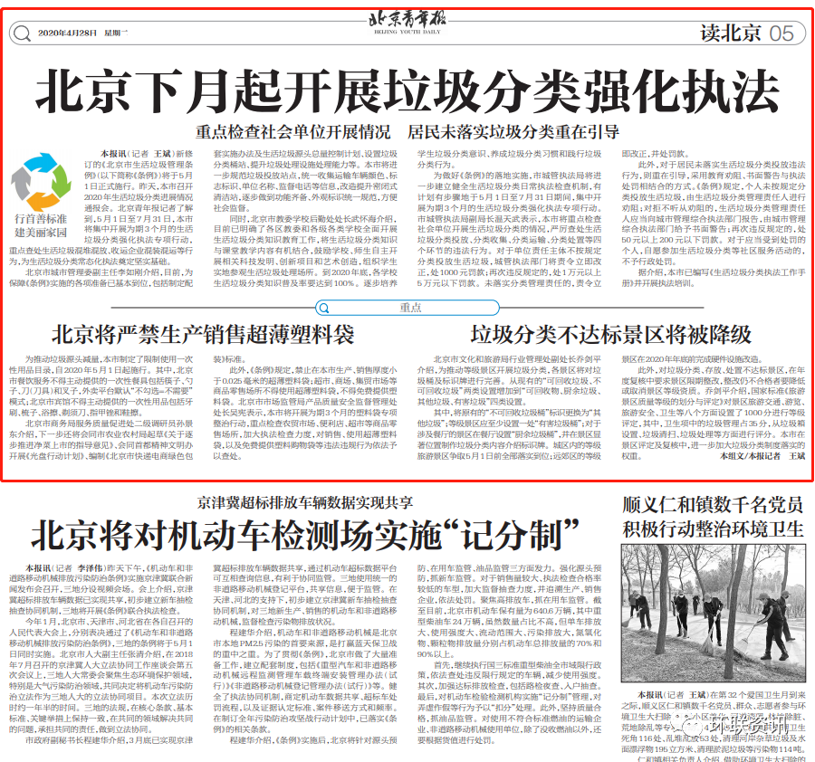 文章導(dǎo)讀新修訂的《北京市生活垃圾管理?xiàng)l例》(以下簡(jiǎn)稱《條例》)將于5月1日正式施行。昨天,北京市召開2020年生活垃圾分類進(jìn)展情況通報(bào)會(huì)。記者了解到,5月1日至7月31日,北京市將集中開展為期3個(gè)月的生活垃圾分類強(qiáng)化執(zhí)法專項(xiàng)行動(dòng),重點(diǎn)查處生活垃圾混堆混放、收運(yùn)企業(yè)混裝混運(yùn)等行為,為生活垃圾分類常態(tài)化...