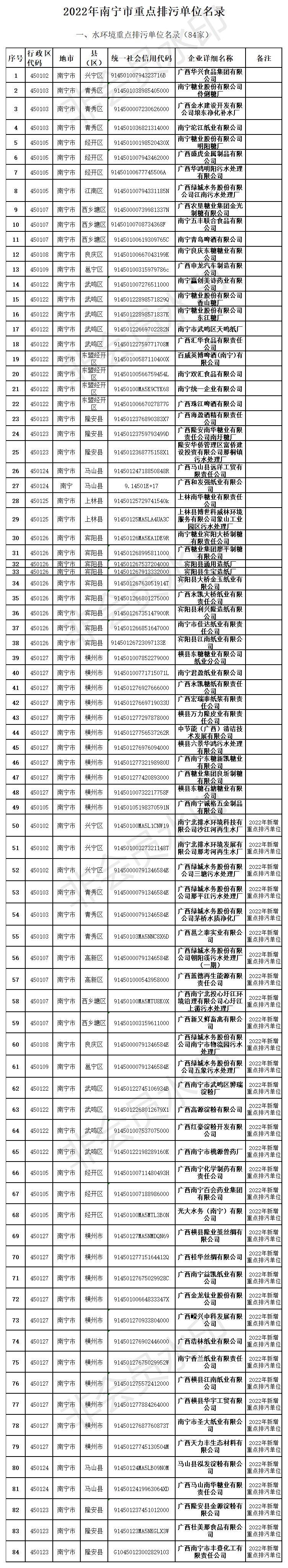 南寧市生態(tài)環(huán)境局關于印發(fā)2022年南寧市重點排污單位名錄的通知 各派出機構,局屬各單位,各有關單位: 為進一步加強污染源環(huán)境管理及環(huán)境信息公開工作,建立健全社會監(jiān)督機制,按照《關于印發(fā)〈重點排污單位名錄管理規(guī)定(試行)〉的通知》(環(huán)辦監(jiān)測〔2017〕86號)、《自治區(qū)生態(tài)環(huán)境廳辦公室關于進一步做好2...