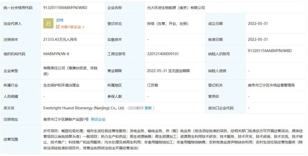 據(jù)企查查顯示,2022年5月31日光大環(huán)資生物能源(南京)有限公司成立,注冊資本2.13億人民幣,法定代表人為呂瑋。經(jīng)營范圍包含許可項目:餐廚垃圾處理;城市生活垃圾經(jīng)營性服務;發(fā)電業(yè)務、輸電業(yè)務、供(配)電業(yè)務(依法須經(jīng)批準的項目,經(jīng)相關部門批準后方可開展經(jīng)營活動,具體經(jīng)營項目以審批結果為準)一般項...