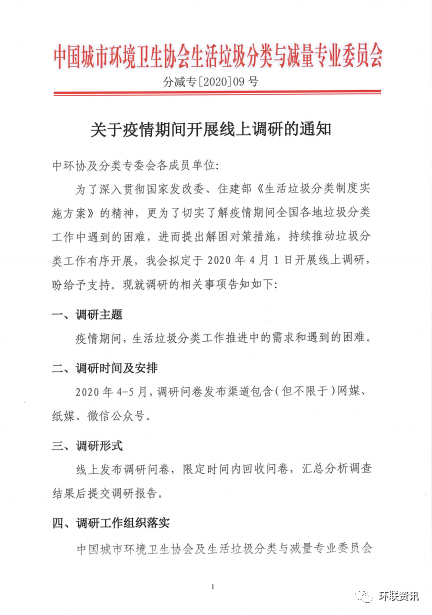 文章導(dǎo)讀實施生活垃圾分類是習(xí)近平生態(tài)文明思想的具體實踐,為了深入貫徹國家發(fā)改委、住建部《生活垃圾分類制度實施方案》的精神,更為了切實了解疫情期間全國各地垃圾分類工作中遇到的實際困難,中國城市環(huán)境衛(wèi)生協(xié)會生活垃圾分類與減量專業(yè)委員會特發(fā)起此次行業(yè)調(diào)研活動。中環(huán)協(xié):開展新形勢下對政府/企業(yè)影響在線問卷調(diào)...