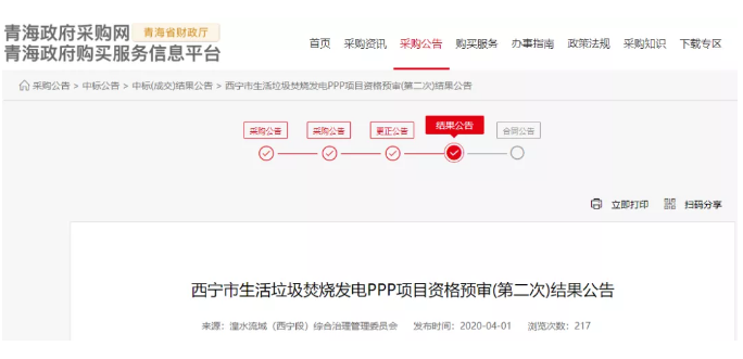 4月1日,青海省西寧市生活垃圾焚燒發(fā)電PPP項目發(fā)布資格預(yù)審結(jié)果公告,九大垃圾焚燒領(lǐng)域知名企業(yè)入圍。據(jù)悉,項目日處理垃圾能力為3000噸,投資估算約16.6億元。資格預(yù)審合格名單具體如下: 深圳市能源環(huán)保有限公司、重慶三峰環(huán)境集團(tuán)股份有限公司、粵豐科維環(huán)保投資(廣東)有限公司、上??岛悱h(huán)境股份有限公...