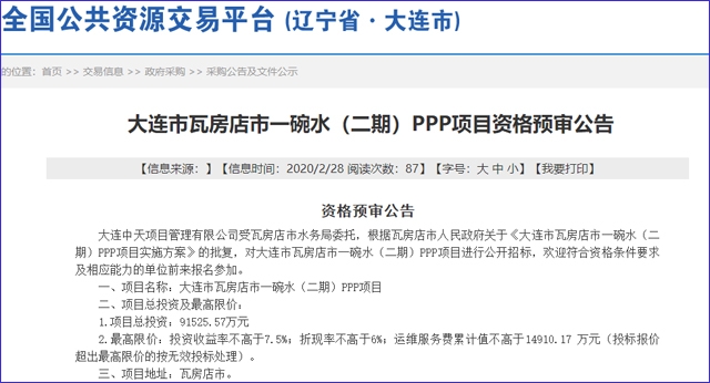 源于大連市公共資源交易管理辦公室日前公開(kāi)消息稱,大連市瓦房店市一碗水(二期)PPP項(xiàng)目正式進(jìn)入公開(kāi)招標(biāo)環(huán)節(jié)。 招標(biāo)公告顯示,該項(xiàng)目包括瓦房店市八一水庫(kù)、瓦房店市九龍水庫(kù)、瓦房店市蓮花水庫(kù)、瓦房店市大河水庫(kù)、瓦房店市永寧鎮(zhèn)水務(wù)中心和瓦房店市復(fù)州城鎮(zhèn)自來(lái)水公司,共四個(gè)水庫(kù)和兩個(gè)凈水廠。 項(xiàng)目合作期限達(dá)2...