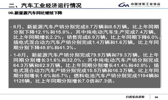 新能源汽車(chē)退補(bǔ)寒流影響之下,7月份我國(guó)新能源汽車(chē)銷(xiāo)量首次實(shí)現(xiàn)負(fù)增長(zhǎng),趨勢(shì)持續(xù)到8月。 9月11日,據(jù)中汽協(xié)發(fā)布的8月份汽車(chē)銷(xiāo)量顯示,我國(guó)新能源汽車(chē)產(chǎn)銷(xiāo)分別完成8.7萬(wàn)輛和8.5萬(wàn)輛,比上年同期分別下降12.1%和15.8%。 1-8月,新能源汽車(chē)產(chǎn)銷(xiāo)分別完成79.9萬(wàn)輛和79.3萬(wàn)輛,比上年同期分別...