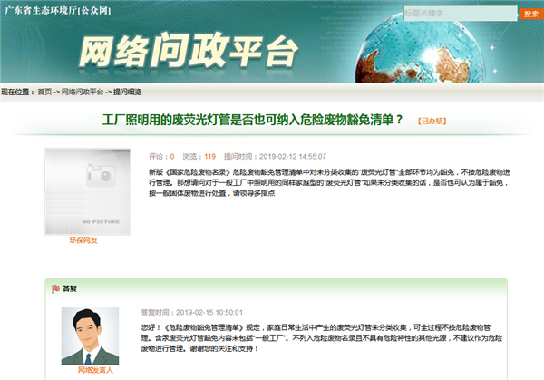 提問:新版《國家危險廢物名錄》危險廢物豁免管理清單中對未分類收集的“廢熒光燈管”全部環(huán)節(jié)均為豁免,不按危險廢物進(jìn)行管理。那想請問對于一般工廠中照明用的同樣家庭型的“廢熒光燈管”如果未分類收集的話,是否也可認(rèn)為屬于豁免,按一般固體廢物進(jìn)行處置,請領(lǐng)導(dǎo)多指點。答復(fù):您好!《危險廢物豁免管理清單》規(guī)定,家...