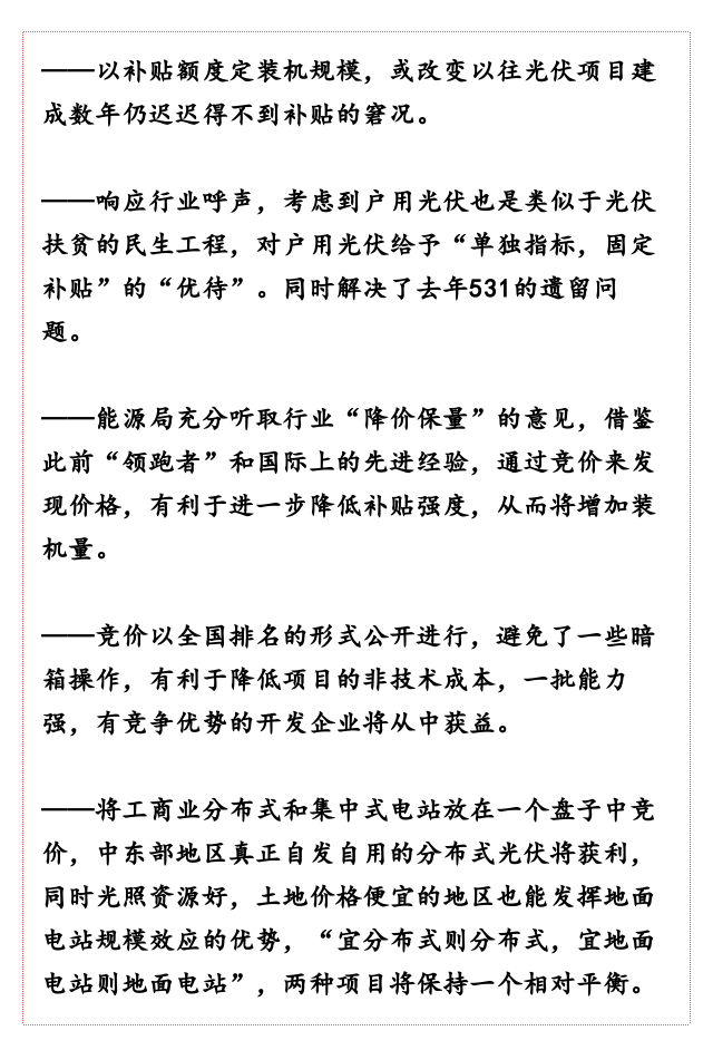 2019年2月18日,國家能源局新能源司召集相關(guān)企業(yè)舉行座談會,就2019年光伏發(fā)電建設(shè)管理相關(guān)工作征求企業(yè)意見。 隨后,中國光伏行業(yè)協(xié)會微信公眾號發(fā)布相關(guān)內(nèi)容表示,會議透露今年我國光伏發(fā)電建設(shè)管理工作將有重大機(jī)制創(chuàng)新。 這七大創(chuàng)新分別是:以補(bǔ)貼額定裝機(jī)量;明確將光伏項目分為需要國家補(bǔ)貼和不需要國家...