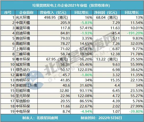 從整體來看,2021年垃圾焚燒發(fā)電企業(yè)發(fā)展態(tài)勢良好,除啟迪環(huán)境、中電環(huán)保等少數(shù)幾家企業(yè)總營收、凈利潤同比下滑外,15家企業(yè)均實(shí)現(xiàn)了營業(yè)收入、凈利潤業(yè)績雙增長,其中綠色動力、圣元環(huán)保營業(yè)收入漲幅翻倍。營收超50億企業(yè)占比過半,行業(yè)整體發(fā)展勢頭良好從上表看,光大環(huán)境、中國天楹、瀚藍(lán)環(huán)境3家企業(yè)營業(yè)收入過...