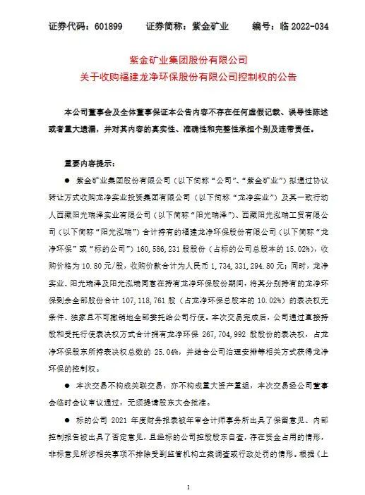 5月9日紫金礦業(yè)公告,擬通過協(xié)議轉(zhuǎn)讓方式收購龍凈實(shí)業(yè)投資集團(tuán)有限公司及其一致行動人西藏陽光瑞澤實(shí)業(yè)有限公司、西藏陽光泓瑞工貿(mào)有限公司合計持有的福建龍凈環(huán)保股份有限公司1.606億股股份(占標(biāo)的公司總股本的15.02%),收購價格為10.80元/股,收購價款合計為人民幣17.34億元。同時,龍凈實(shí)業(yè)、...