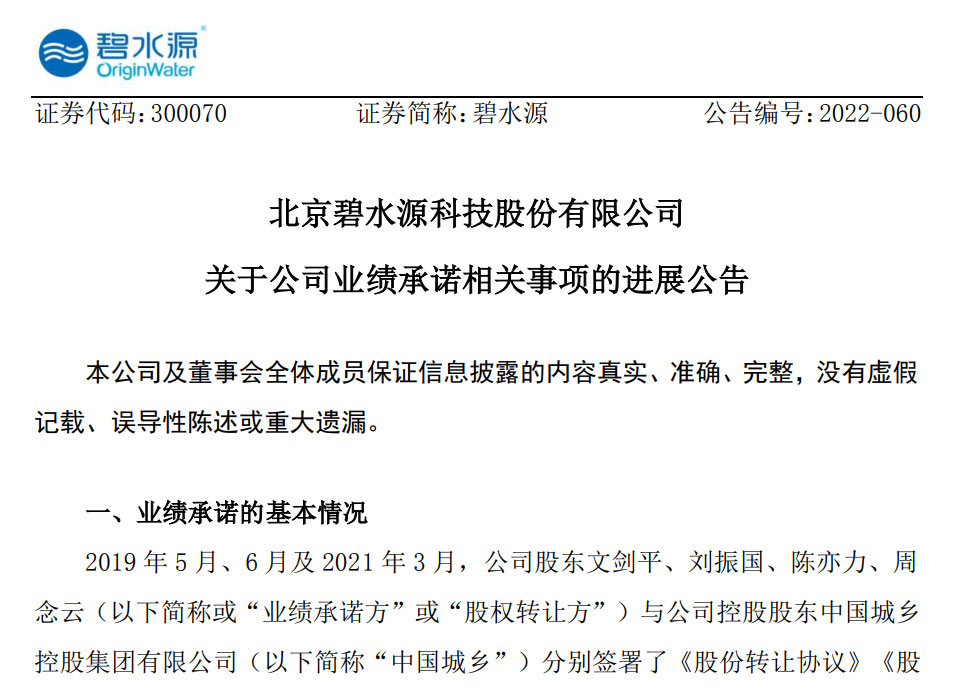 始于2018年的環(huán)保企業(yè)PPP暴雷潮,直到現(xiàn)在還余波未平。最新一則案例是,5月9日,碧水源董事會發(fā)布公告稱,公司股東文劍平、劉振國、陳亦力、周念云在與中國城鄉(xiāng)控股集團(tuán)有限公司(下稱“中國城鄉(xiāng)”)股份轉(zhuǎn)讓時曾作出業(yè)績承諾補(bǔ)償約定。而2021年公司的業(yè)績低于該約定,觸發(fā)業(yè)績補(bǔ)償義務(wù),需補(bǔ)償約10.04億...