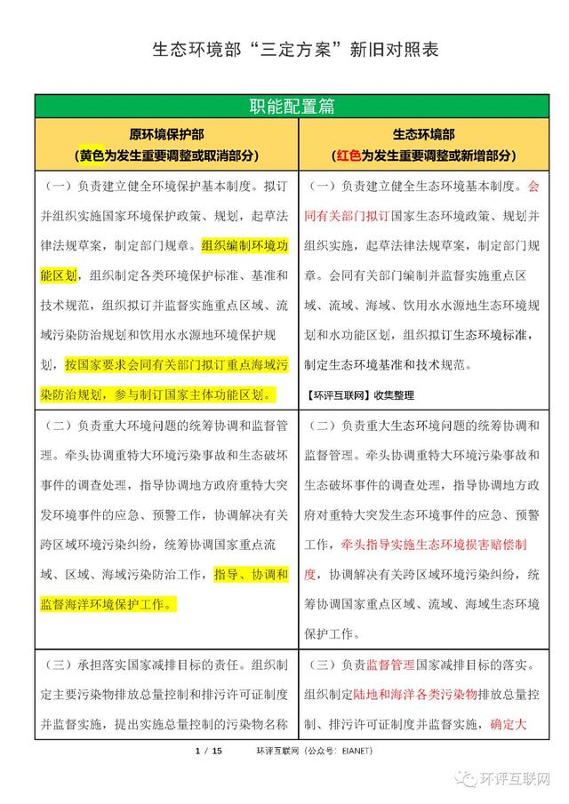 近日,生態(tài)環(huán)境部“三定方案”已經(jīng)印發(fā),在重新整合了部門的職責(zé)之外,還增設(shè)了新的職能及崗位。為方便大家更好地理解生態(tài)環(huán)境部前后職能配置、內(nèi)設(shè)機(jī)構(gòu)和人員編制的變化,環(huán)環(huán)整理編輯發(fā)布新舊“三定方案”對(duì)照表,以供參考。特別說明:生態(tài)環(huán)境部“三定方案”以官網(wǎng)最終發(fā)布版本為準(zhǔn)。01職能變化1. 新增“中央生態(tài)環(huán)...