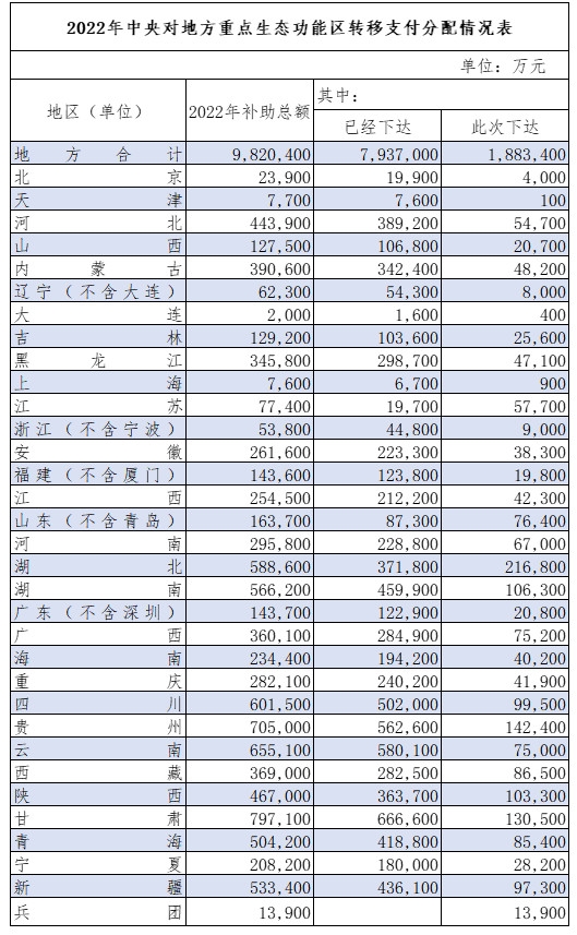 據(jù)財政部網站消息,為推進生態(tài)文明建設,引導地方政府加強生態(tài)環(huán)境保護,提高生態(tài)功能重要地區(qū)基本公共服務保障能力,近日,財政部下達2022年重點生態(tài)功能區(qū)轉移支付預算188.34億元,加上此前已下達部分,已累計下達預算982.04億元。 原標題:財政部下達資金188.34億元 引導地方政府加強生態(tài)環(huán)境保...