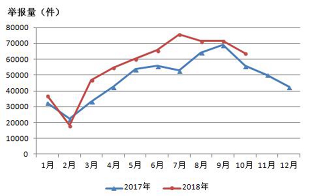 2018年10月,全國環(huán)保舉報管理平臺共接到環(huán)保舉報63883件,已受理54305件。其中,“12369”環(huán)保舉報熱線電話共31354件,微信舉報25831件,網(wǎng)上舉報6698件。從污染類型來看,10月大氣污染、噪聲污染舉報較多。 一、秋冬季舉報出現(xiàn)下降趨勢 2018年10月...