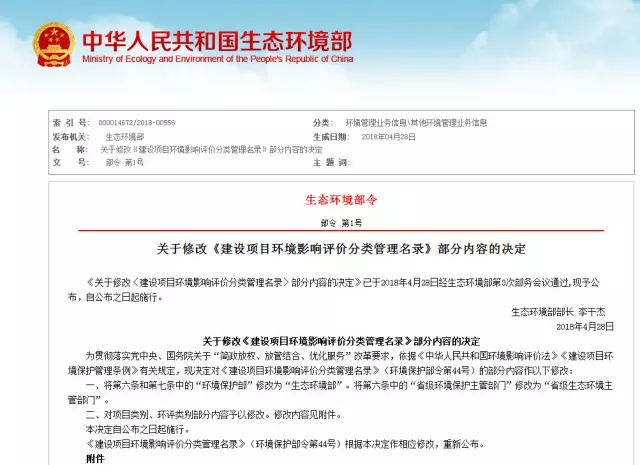 生態(tài)環(huán)境部2018年第3次部務(wù)會審議并通過了《關(guān)于修改<建設(shè)項(xiàng)目環(huán)境影響評價(jià)分類管理名錄>部分內(nèi)容的決定》,對《建設(shè)項(xiàng)目環(huán)境影響評價(jià)分類管理名錄》(環(huán)境保護(hù)部令第44號)的部分內(nèi)容予以修改,并于公布之日起實(shí)施。來源:生態(tài)環(huán)境部修改《建設(shè)項(xiàng)目環(huán)境影響評價(jià)分類管理名錄》,是落實(shí)習(xí)近平總書記重...