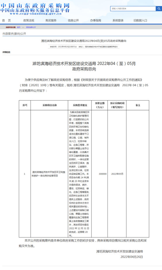 采購項目名稱:濰坊濱海經(jīng)濟(jì)技術(shù)開發(fā)區(qū)環(huán)衛(wèi)和園林養(yǎng)護(hù)一體化特許經(jīng)營項目預(yù)算金額:300000(萬元)預(yù)計采購時間:2022年05月采購需求概況:為解決目前濱海區(qū)環(huán)衛(wèi)和綠化養(yǎng)護(hù)管理問題,打造更好的公共環(huán)境,提高整個濱海區(qū)的環(huán)境衛(wèi)生和綠化質(zhì)量,本項目將選擇適當(dāng)位置擬建若干口袋公園、公廁、城市出入口、垃圾中...