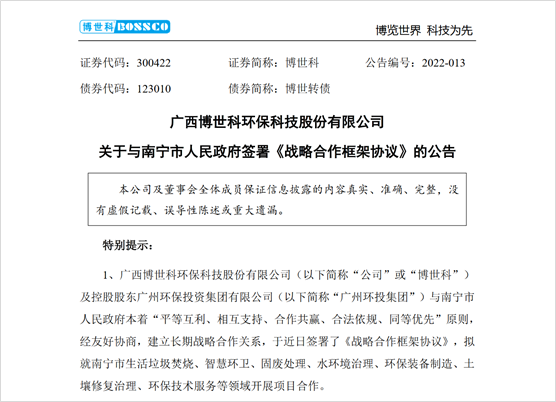 近日,博世科(300422.SZ)發(fā)布公告,公司及控股股東廣州環(huán)保投資集團有限公司(簡稱“廣州環(huán)投集團”)作為乙方與南寧市人民政府(甲方)近日簽署了《戰(zhàn)略合作框架協(xié)議》,擬就南寧市生活垃圾焚燒、智慧環(huán)衛(wèi)、固廢處理、水環(huán)境治理、環(huán)保裝備制造、土壤修復治理、環(huán)保技術服務等領域開展項目合作。 協(xié)議內容顯示...